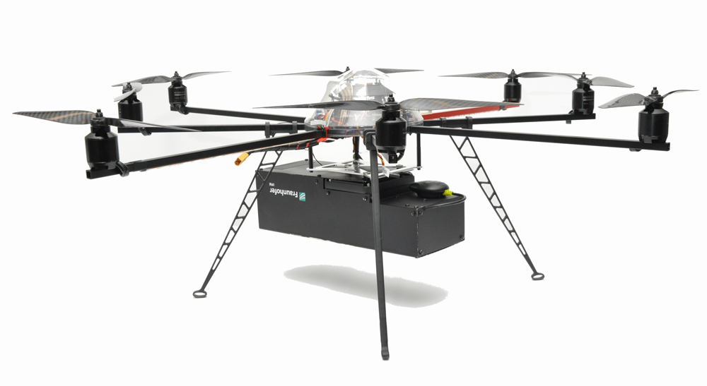 The Fraunhofer Institute is working on a method of traffic counting and evaluation of overtaking processes at busy hubs. The flight robot used here (based on MikroKopter technology) is in continuous use for up to 9 hours a day.